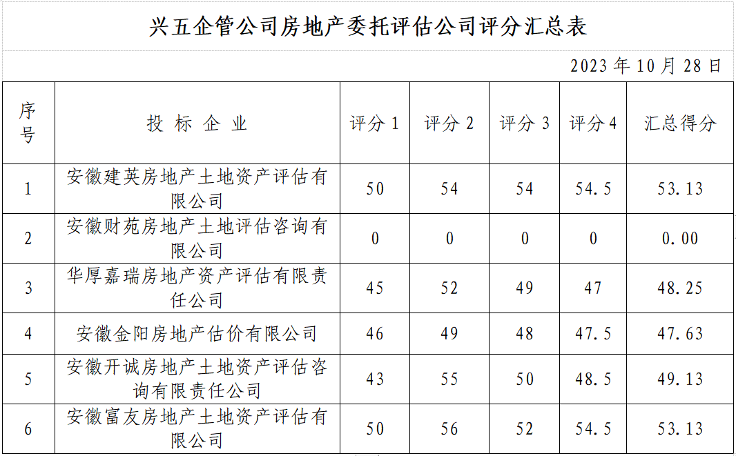依据兴五企管公司2023年10月19日在“优质采”平台发布的《关于公开征集房地产委托评估备选评估机构公告》、《关于房地产委托评估备选评估机构评选实施细则的通知》及评分情况,现将兴五企管公司房地产委托评估备选评估机构征集结果公示如下: