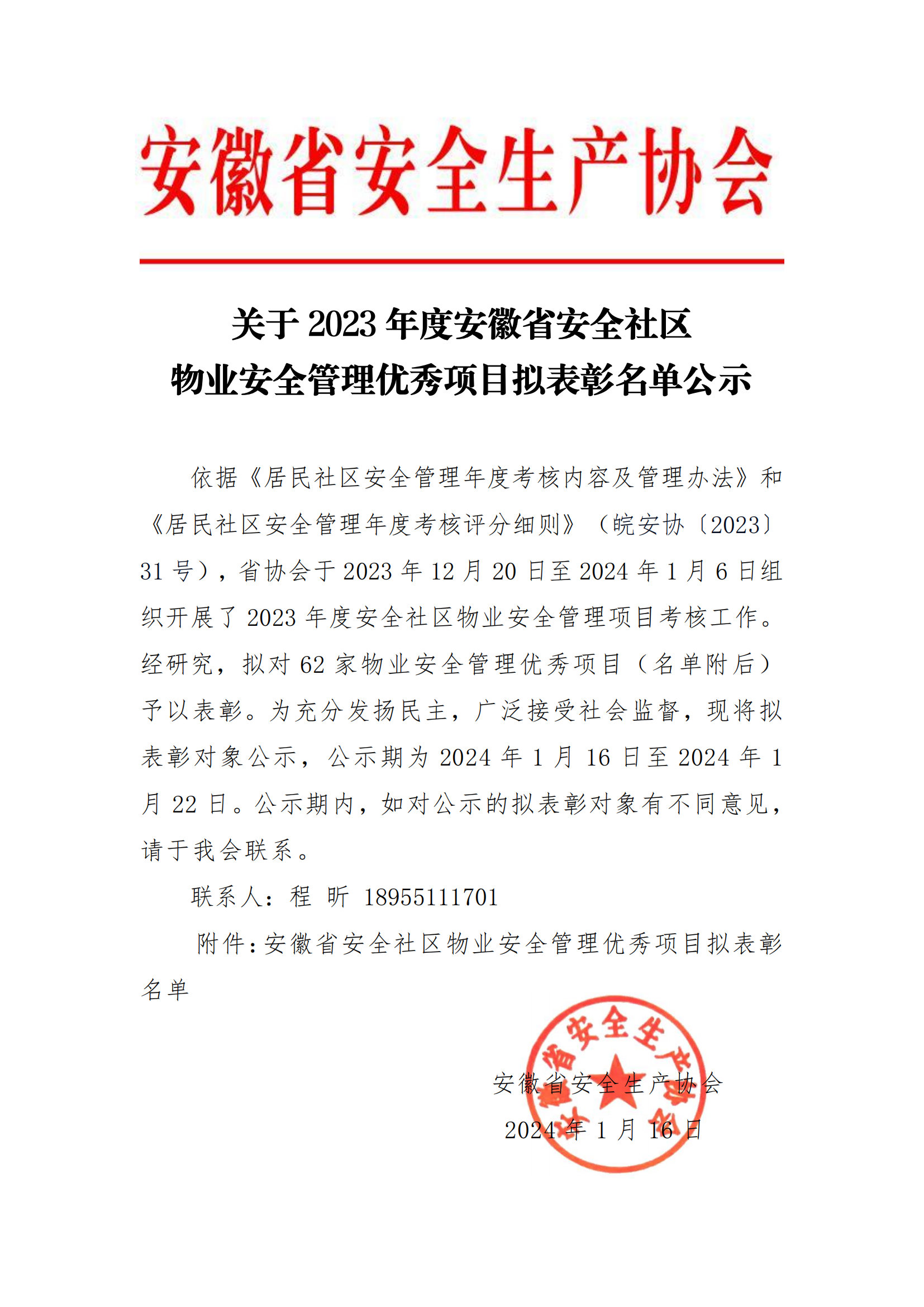 日前,安徽省安全生产协会针对在2023年度省安全社区物业安全管理上表现优秀的项目名单进行了公示。经过前期考评,拟对62家物业安全管理优秀项目予以表彰。其中,由365英国上市和信置业公司管理的城关镇花园新村项目,凭借专业的服务和标准化管理入列此次优秀项目名单。中安在线对此进行报道。
