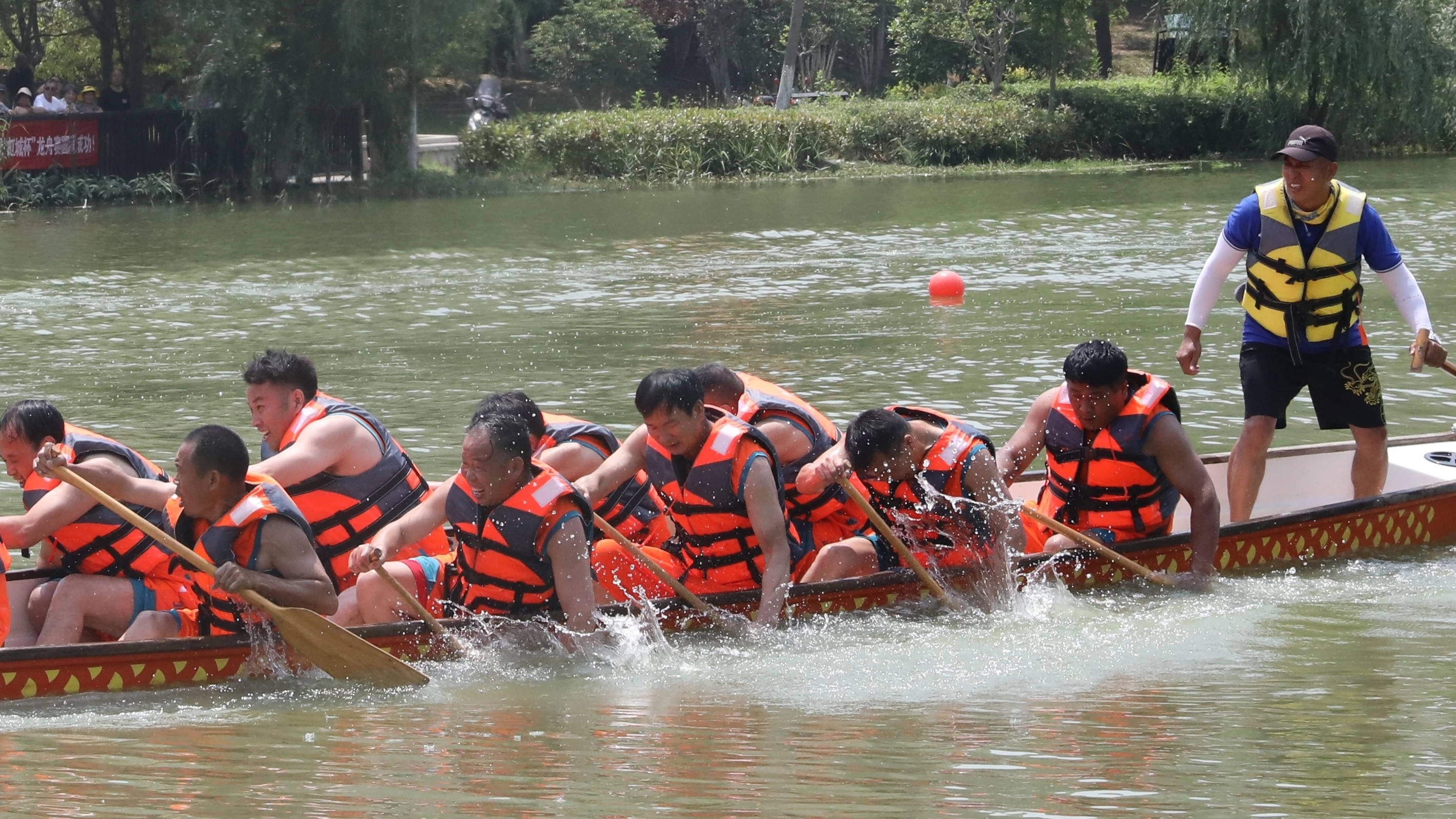 本届龙舟邀请赛邀请到29支参赛队伍和3支女子队伍,在漴河上展开激烈角逐。发令枪声响起,比赛正式开始。宽阔的河面上,伴随着“咚咚咚咚”的鼓点声,一艘艘龙舟如离弦之箭,劈波斩浪,奋勇争先。大家齐心协力,默契十足,奋力向前。这是属于五河的“速度与激情”,岸边的观众也被运动健儿的速度与激情点燃,吆喝声和加油声一浪接一浪。