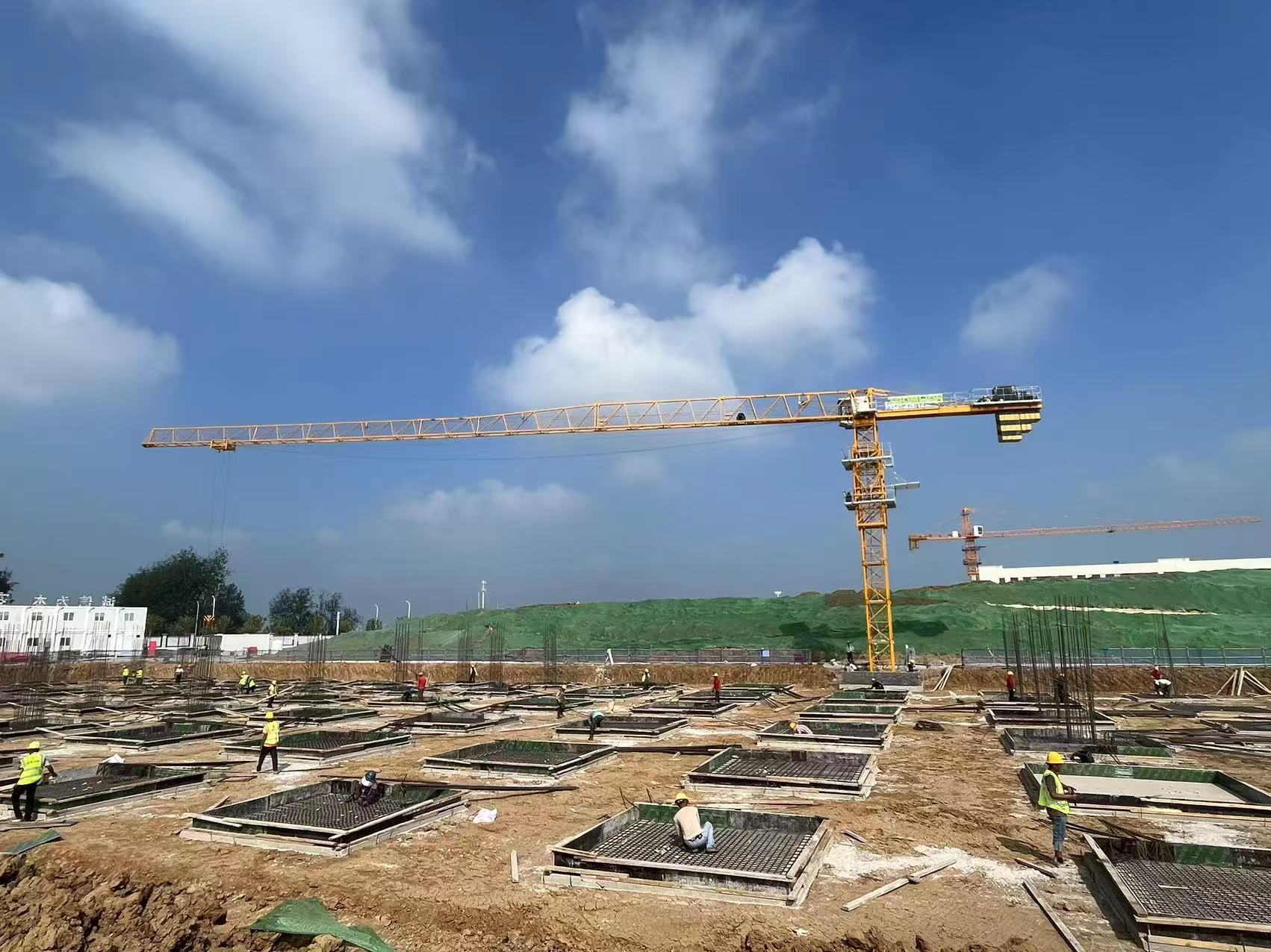 建筑工地上,只见挖掘机在不停作业,数百名工人正在各自的建筑区域忙碌作业,有在搭设支模架的、有在绑钢筋的、有在楼面模板铺设的、有在浇筑的……大家正全力以赴赶工期。