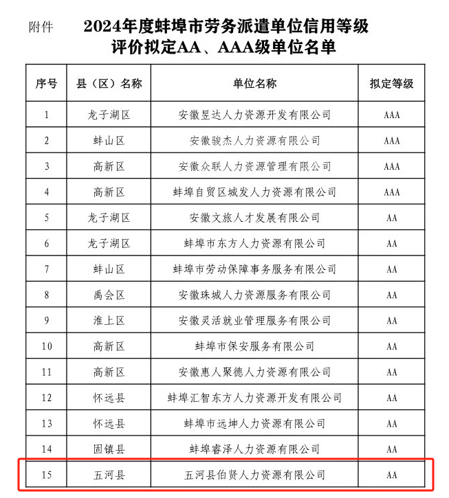 喜报 | 五河县伯贤人力资源有限公司荣获蚌埠市劳务派遣单位AA级信用评价!