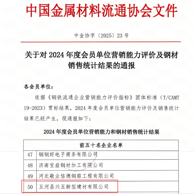 近日,中国金属材料流通协会(以下简称“中金协”)正式发布“2024年度会员单位营销能力评价及钢材销售统计结果的通报”,五河县兴五新型建材有限公司(以下简称“兴五建材公司”)凭借卓越的市场表现和行业贡献成功入选50强。