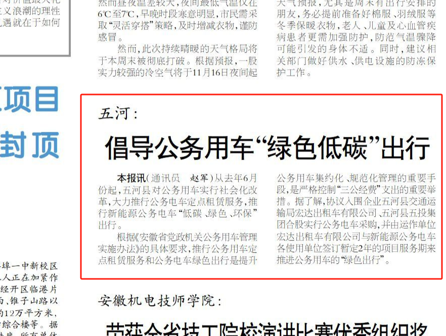 近日,《蚌埠日报》对五河县公务用车社会化改革及绿色出行举措进行了专题报道,充分肯定了公务用车领域推行新能源、践行“低碳、绿色、环保”理念的显著成效与示范意义。